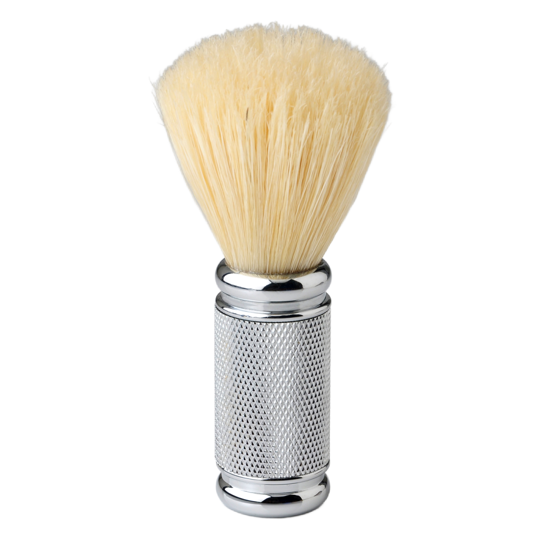 - Una brocha de gran calidad, fabricada a mano siguiendo un proceso artesanal. Su mango ergonómico de latón sólido con acabado Premium Chrome texturizado, su nudo meticulosamente diseñado y su peso ideal le permitirán una experiencia de afeitado agradable y moderna.