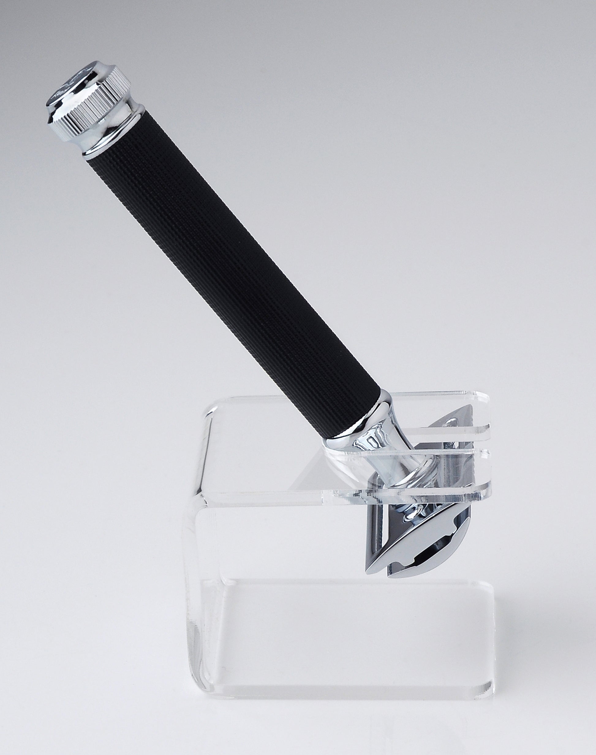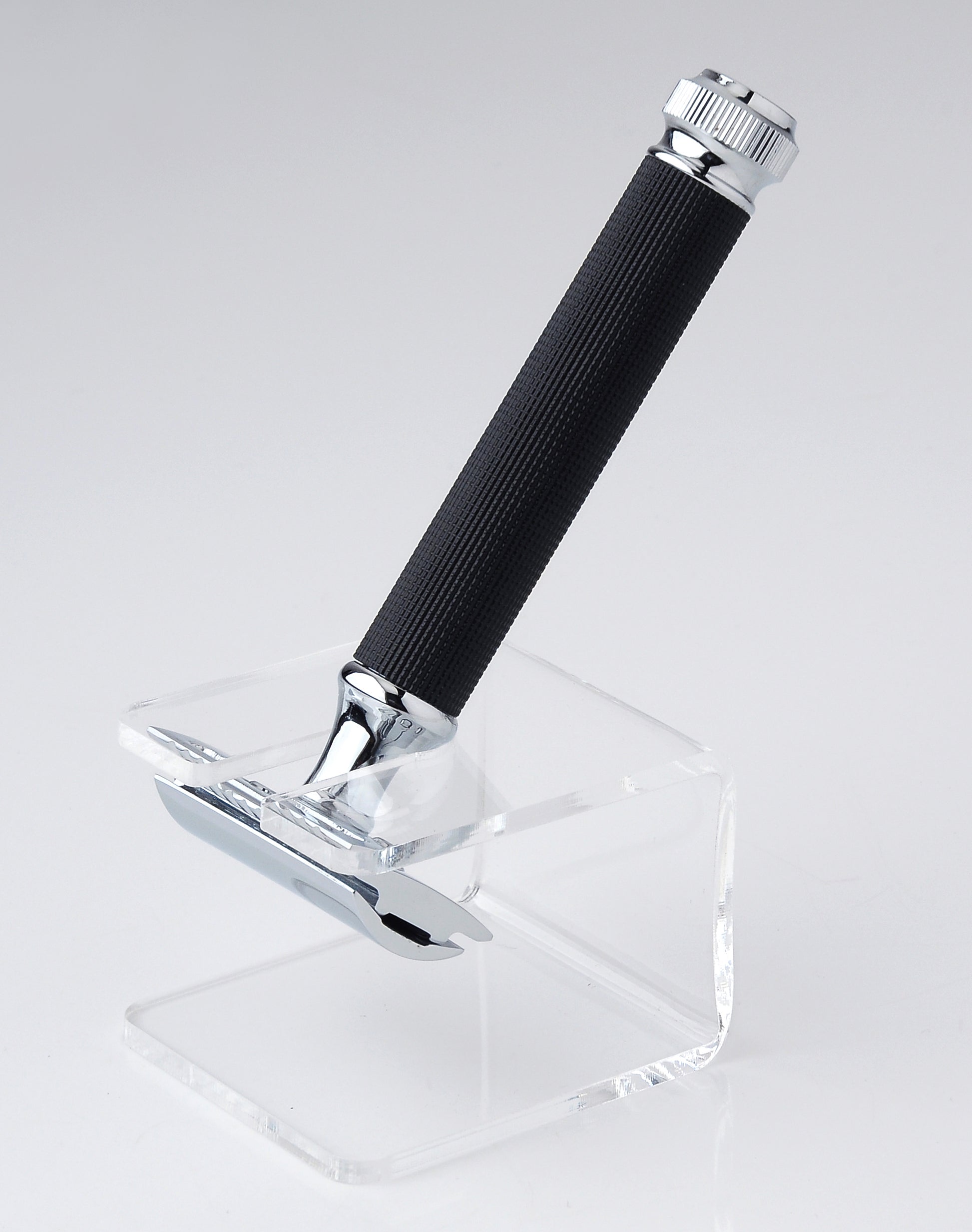 El soporte Pearl para maquinillas de afeitar clásicas, fabricado en acrílico transparente resistente a los impactos, es ideal para guardar la mayoría de las máquinas de afeitar de doble hoja.